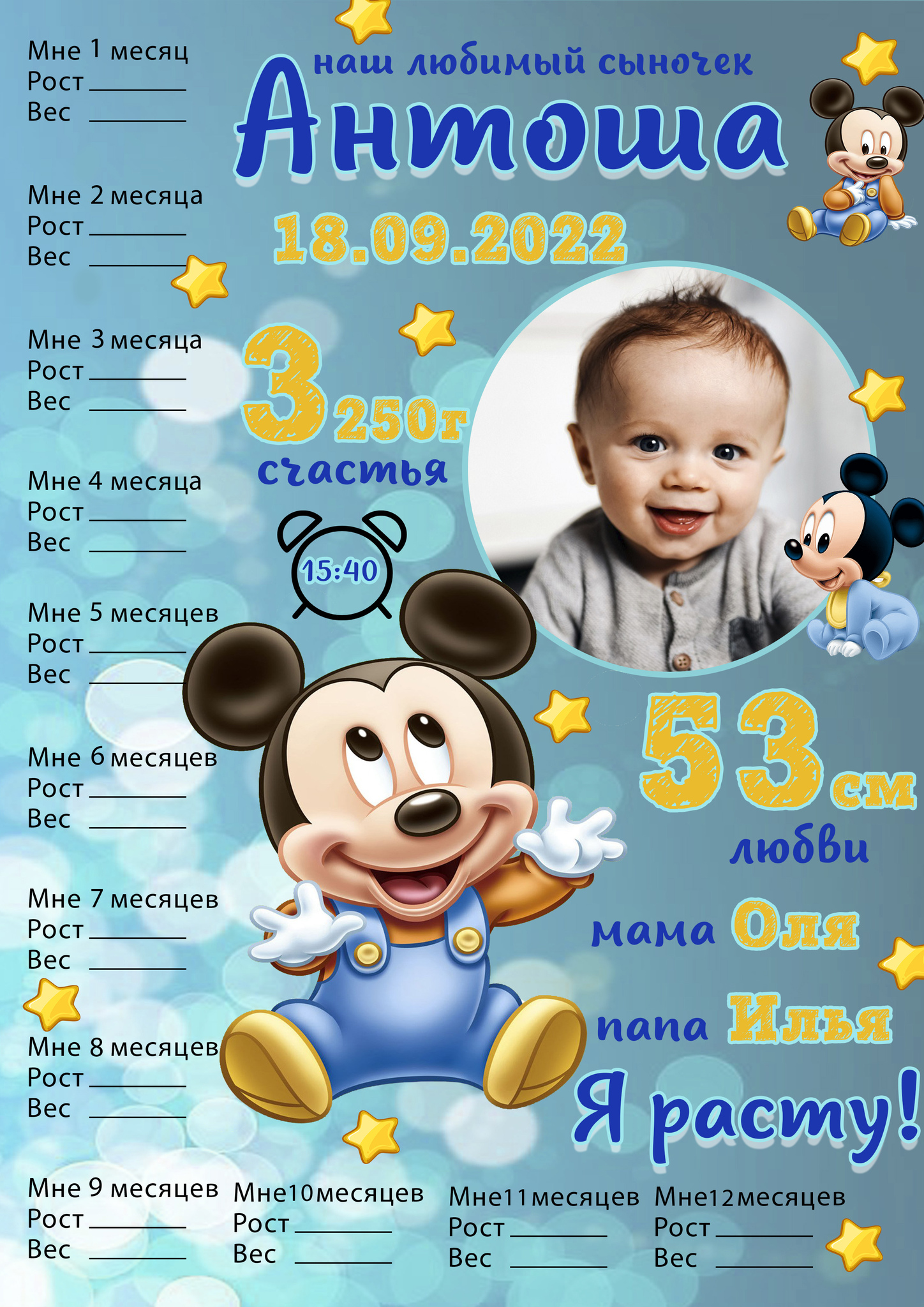 Персонализация: Укажите имя ребенка, дату, точное время рождения, вес и рост.