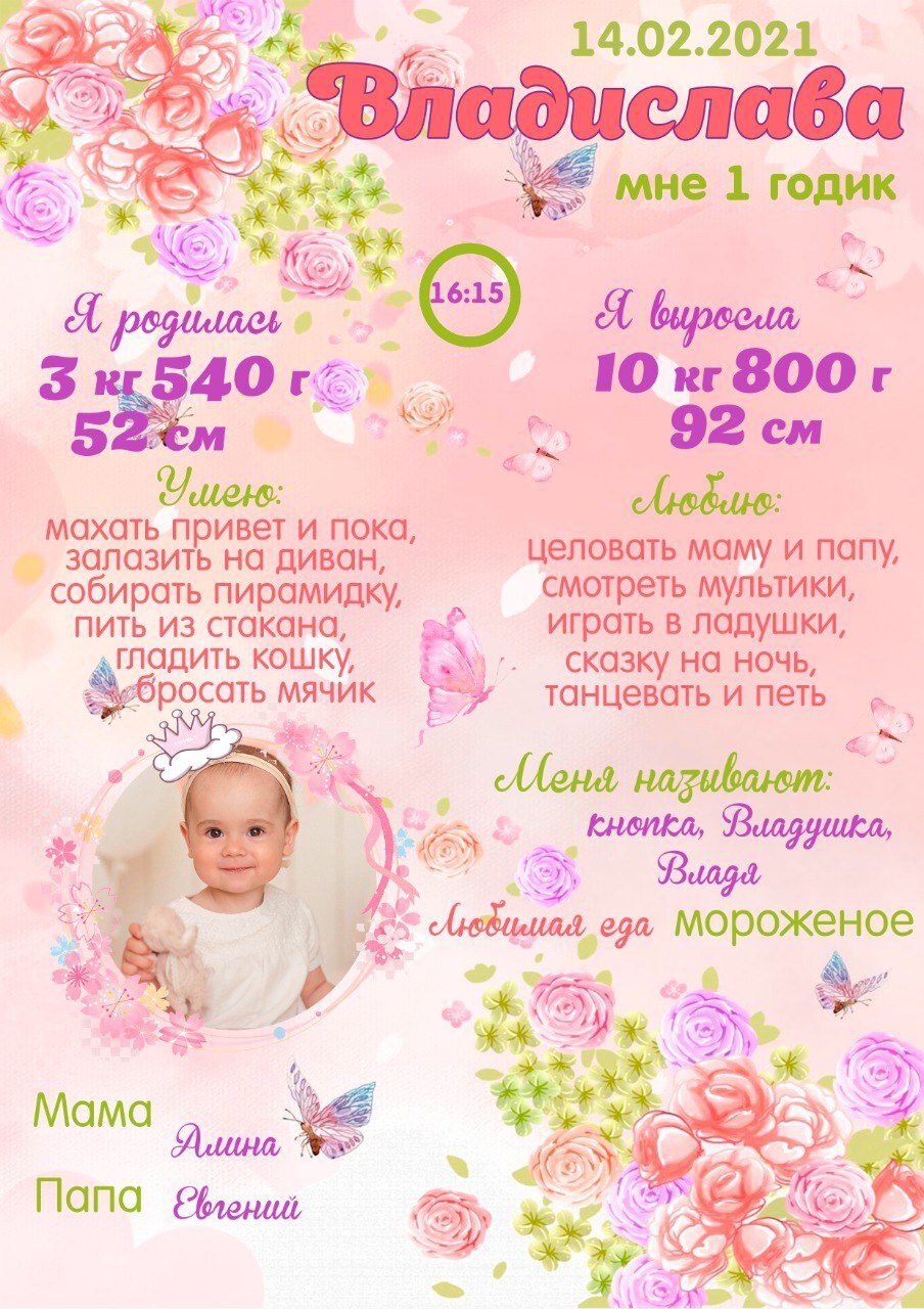 Персонализация: Укажите имя ребенка, дату, точное время рождения, вес и рост.